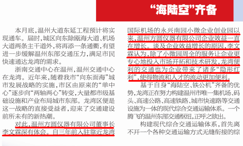 日前,溫州日報(bào)記者采訪了溫州方圓儀器有限公司董事長李文霖先生。對公司入駐靠近龍灣國際機(jī)場的永興南園以來取得的快速發(fā)展給予了充分肯定,稱贊了公司效益的巨大提升。談及企業(yè)效益增長的原因,李文霖認(rèn)為,除了小微園帶來周全的服務(wù)讓企業(yè)更專心地投入市場開拓和技術(shù)研發(fā),龍灣便利的交通也為企業(yè)帶來了諸多隱形紅利,使得物流和人才的流動更加便利。愿溫州方圓儀器有限公司更上一層樓。